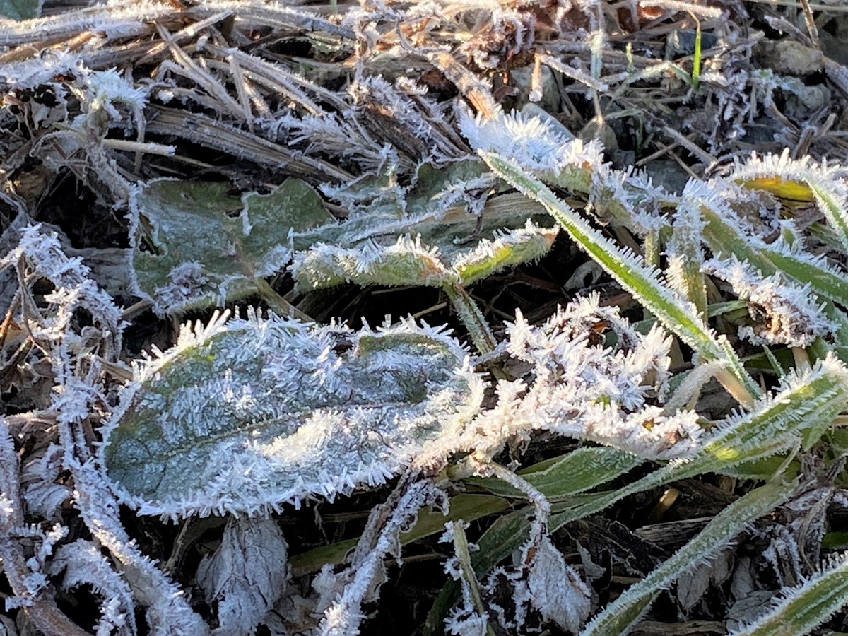 クリニック駐車場の片隅、立派な霜が降りていました。
